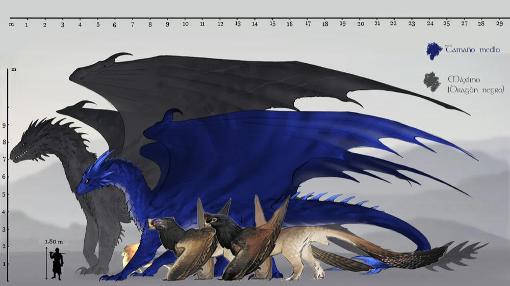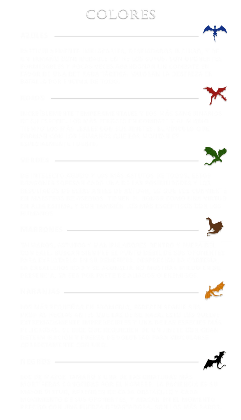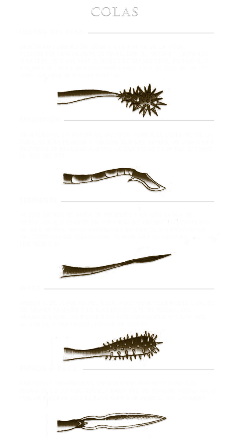 De entre las criaturas magníficas que habitan el mundo, los dragones, al igual que los grifos en Poromiel, decidieron hace eones vincularse a la raza humana en un pacto de mutuo beneficio, compartiendo así sus conocimientos y su magia. E incluso así continúan fascinando a estudiosos y jinetes a la par, pues tal es la naturaleza reservada de su especie que pareciera haber toda una sociedad oculta a los humanos, con su propia cultura, leyes y jerarquía de la que apenas se conocen datos.Lo que sí se conoce y se ha estudiado más en profundidad —aunque no demasiado— es la relación entre jinete y dragón. Pasado el segundo trimestre, los cadetes que hayan sobrevivido a la instrucción hasta entonces son recompensados con su primer contacto en solitario con un dragón y ofrecida la oportunidad de vincularse a uno. “Ofrecida” es la palabra, pues son los dragones, en última instancia, quienes deciden cuándo, cómo y por qué eligen a cierto cadete: aquellos que logren demostrar su valía serán escogidos por uno de ellos, formalizando esta relación mediante un “sello” mágico, que no solo vincula a ambos psíquicamente, sino que también canaliza la magia de estas criaturas a través de él, otorgando al usuario el control arcano de un aspecto esencial de la naturaleza.Al igual que ocurre con los humanos, los dragones se presentan en una increíble variedad de formas, colores y tamaños. De entre las conocidas por la humanidad de distinguen en dos categorías: por el color de sus férreas escamas y por la forma de sus colas.